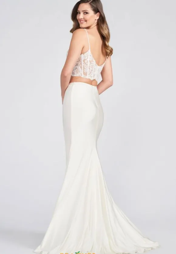 Show off your amazing fashion sense and wear this sexy and chic two piece style EW122043 by Ellie Wilde. The corset style bodice has a mesh illusion base adorned with sparkling lace appliques. The jersey fit skirt showcases beautiful bead work that flows from the waist down the slit. Additional features include a v neckline and train.