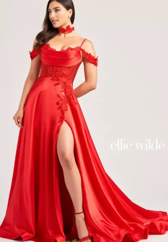 Have all eyes on you when you wear this dress style EW35029 by Ellie Wilde. This A-line dress comes in black and red. This dress features a gorgeous detachable lace off the shoulder and a flattering sweetheart neckline. This satin dress is completed with a fabulous slit, sweep train, lace choker and pockets!