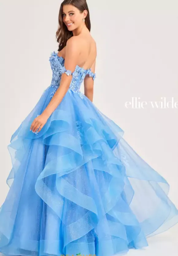 Look like a modern day princess in this glamorous A line gown by Ellie Wilde EW35084. Showcasing a classy off the shoulder sweetheart neckline adorning the fitted bodice. The flowy A line skirt is made with a fun ruffled effect and gorgeous floral appliques that match the fitted bodice. This is the perfect dress for you to wear at your prom.