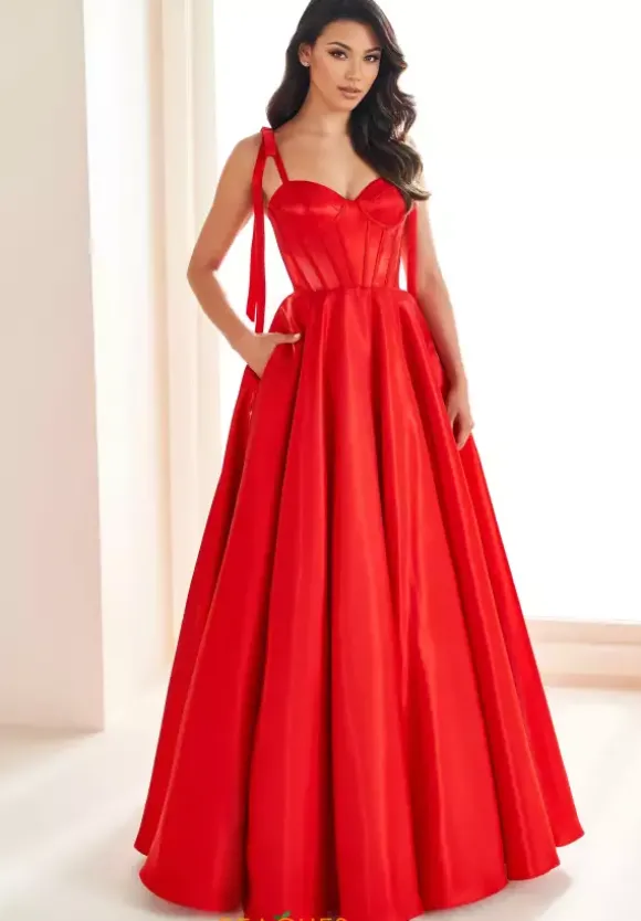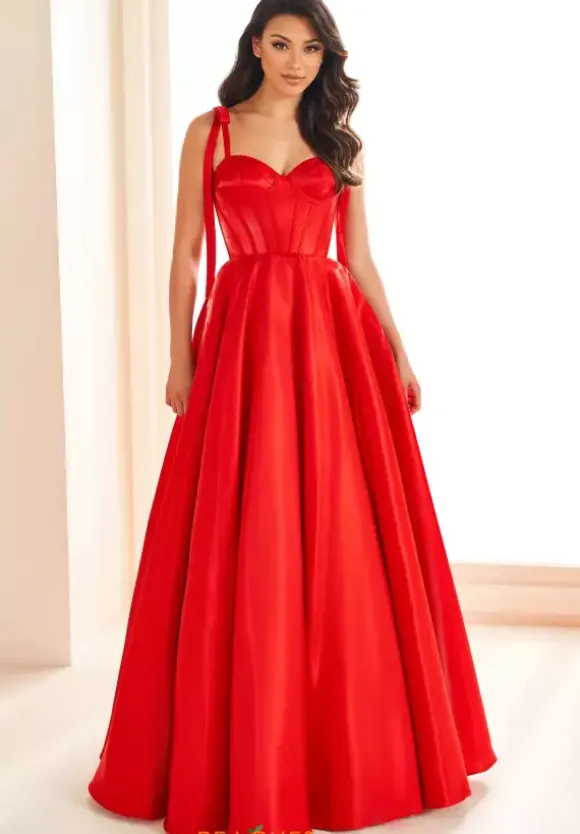 Simple sophistication exudes when you wear this glamorous Ellie Wilde long dress style EW32610 to your prom. Made is gorgeous shades of satin fabric, this impeccable style features a structured corset bodice with a sweetheart neckline, shoulder tie thick straps and lace up tie back. The full, ball gown, long skirt has side pockets and a hemline that flows to the floor.