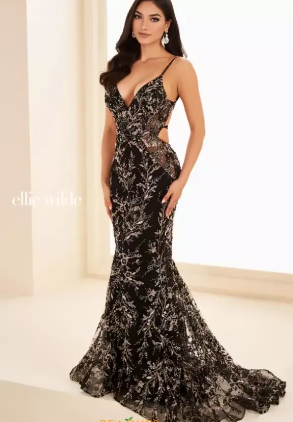 Get noticed at this years prom in this shimmering Ellie Wilde long dress style EW37047 made in glitter tulle with embroidery and beads. This glistening gown showcases a fitted bodice with a V neckline, adjustable shoulder straps and low open lace up tie back. The long slim skirt has a mermaid skirt with sweeping back train with a horsehair hem edge.