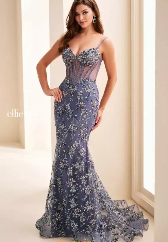 Unleash your beauty in this sequin encrusted Ellie Wilde prom dress style EW37058. Luminous beads and sequins encrust the v-neckline to perfectly match the fitted floral sweep train no slit skirt. Intricate beaded boning is displayed symmetrically throughout the sheer illusion adjustable corset bodice.