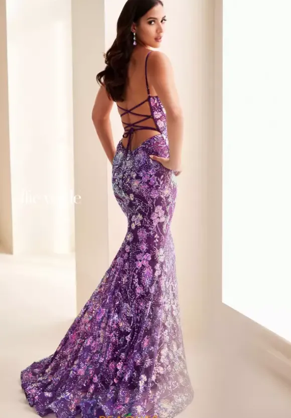 Look like an icon in this shimmering Ellie Wilde sequin prom dress style EW37127. This shimmering adjustable corset dress flaunts a plunged sweetheart neckline with color matching mesh to match the boning. Radiant flower detailed glittering lace adorns this fitted dress all the way down to the sweep train.