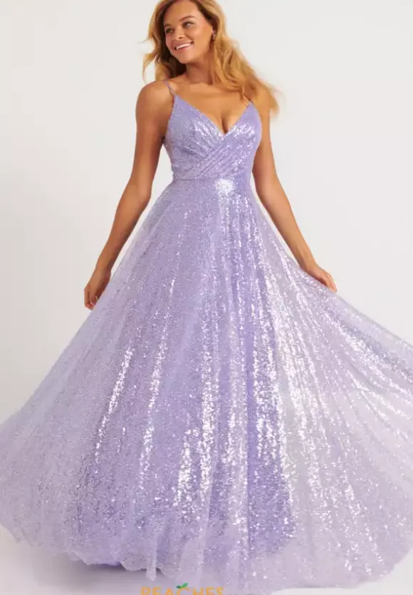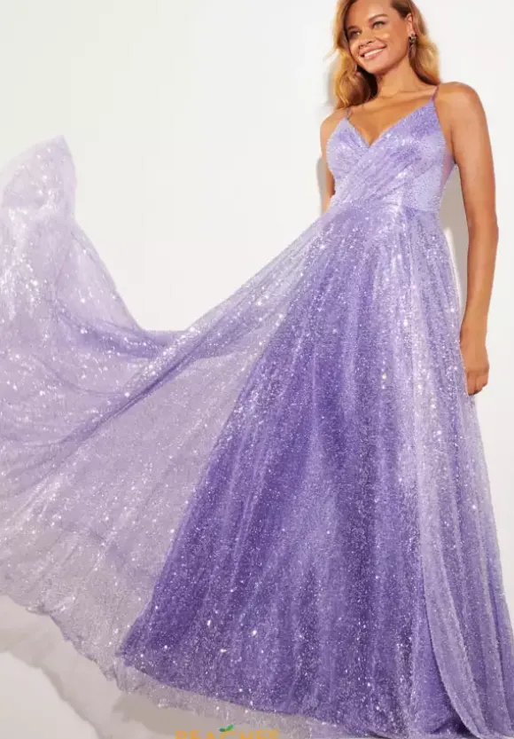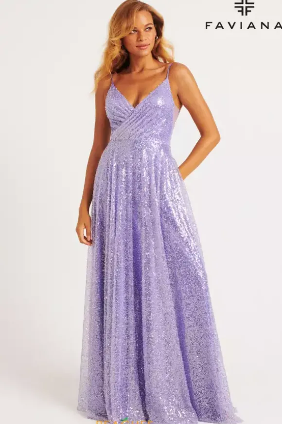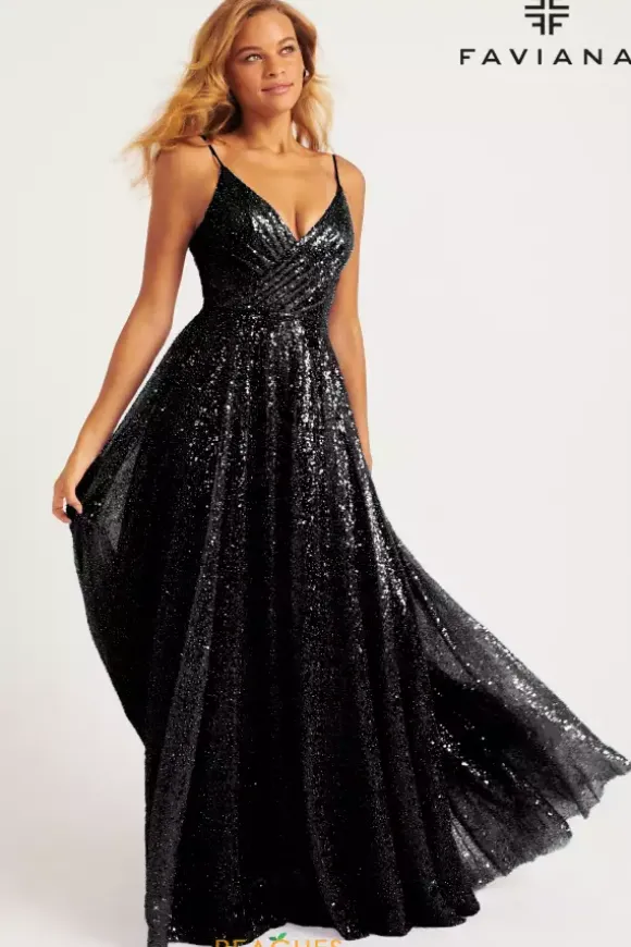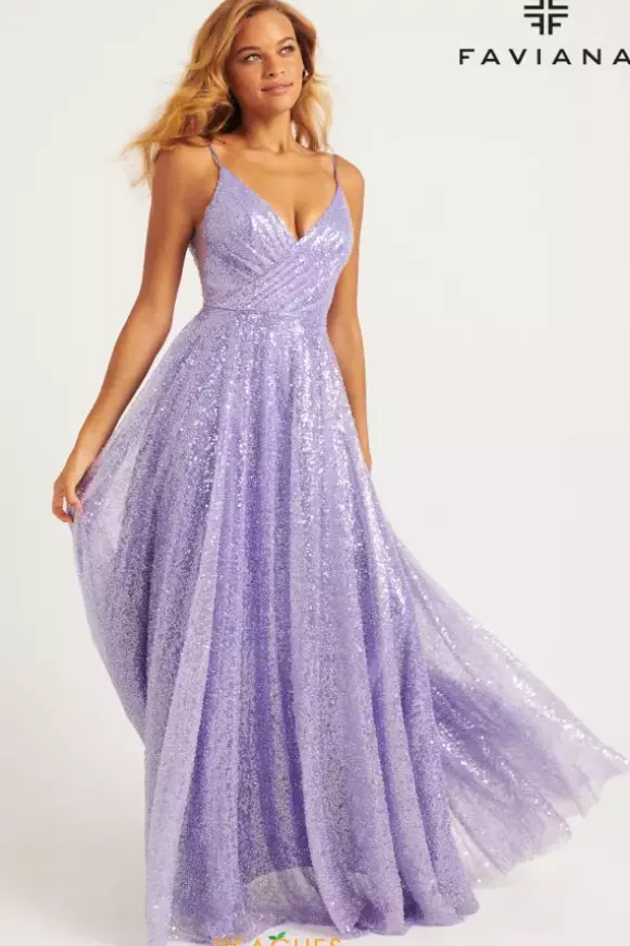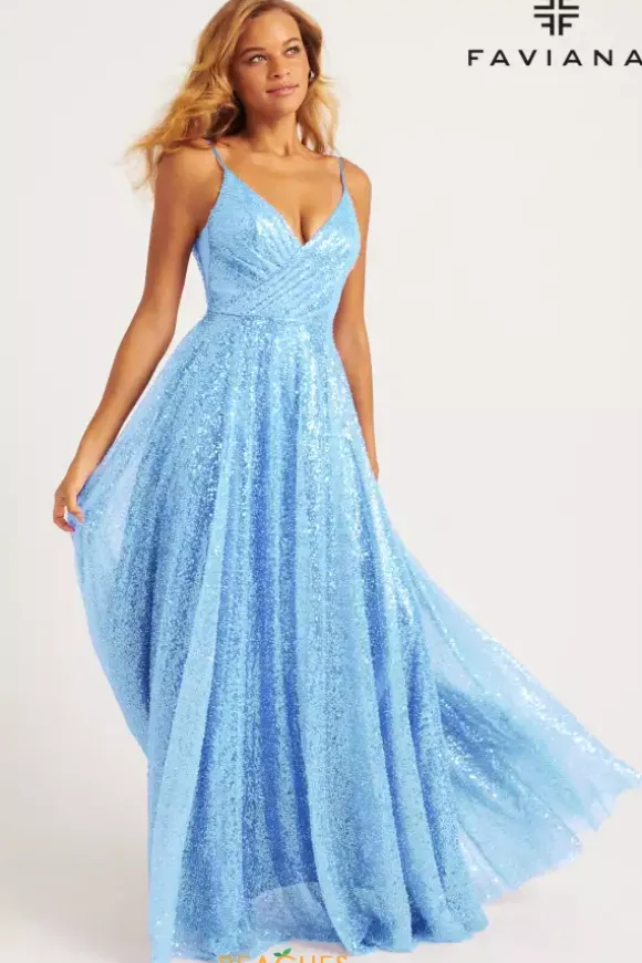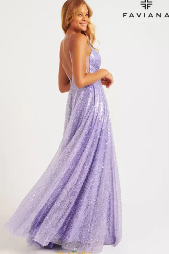 Dance the night away in this al over sequins A line dress from Faviana style 11203. This dress showcases a v neckline thin straps and scoop v open back. The side panels of the bodice are sheer illusion with a wrapped effect in the front with the material. The flowing sparkling skirt falls from the small of your waist.
