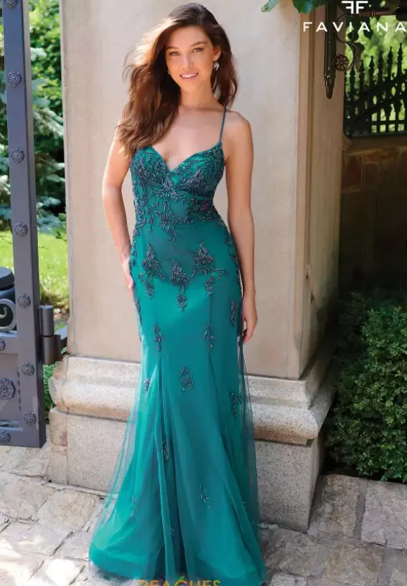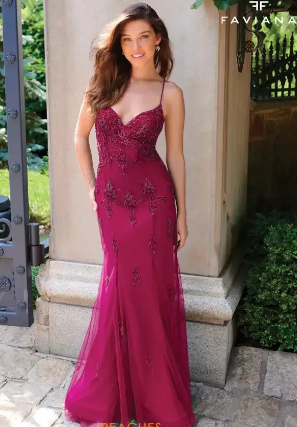 Draw the attention immediately wearing the remarkable long style 11227 by Faviana. The lovely top features a v neckline and displays a fascinating open back detailed with a tie lace corset to instantly snatch the waistline. Made in a trumpet silhouette and beautifully adorned with intricate clusters of applique and beadwork.