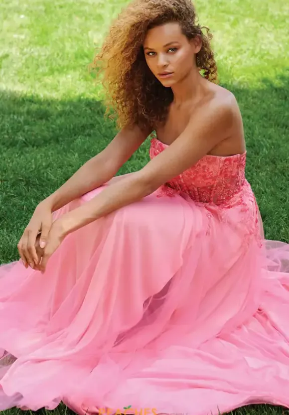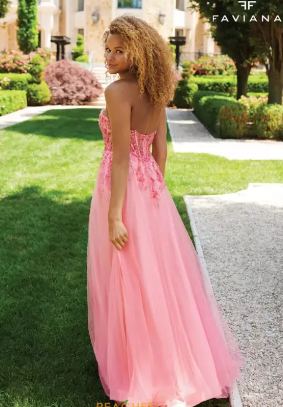 Make the statement of the season with the bold long style 11233 by Faviana. The strapless straight across neckline displays an illusion bodice embellished with sweet floral applique that meticulously trickles down the small of the waist and finishing perfectly along the beautiful flowing tulle skirt.