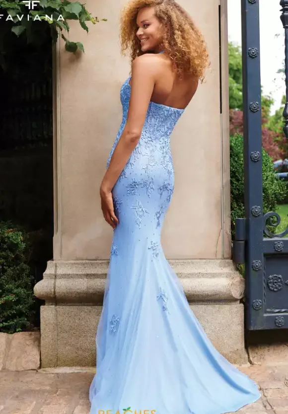 Wear this elegant and chic Faviana dress 11234 for your special occasion. This stylish fitted dress showcases a deep v neckline with high halter straps that clasps behind the neck. The fitted bodice is garnished with unique applique that cascades into the tulle skirt showing of your thigh high slit.
