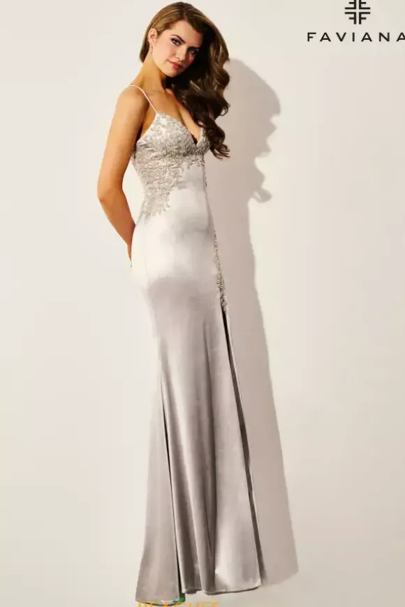 Be the talk of the night when you wear this long fitted dress by Faviana style 11401. This dress features a V neckline that cascades into a open corset back that laces up and is also open. The dress is made from stretch satin material and beading along the top and the slit as well as a train that will follow behind you.