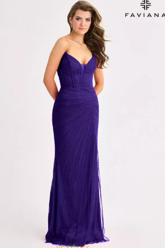 Show up and sh ow off at your special event wearing Faviana style 11410. This eye catching fitted silhouette showcases a fierce v neck strapless neckline paired with an accentuating lace up open back. Completely embellished with dazzling sequins, this dress features a thigh high slit and graceful sweep train.