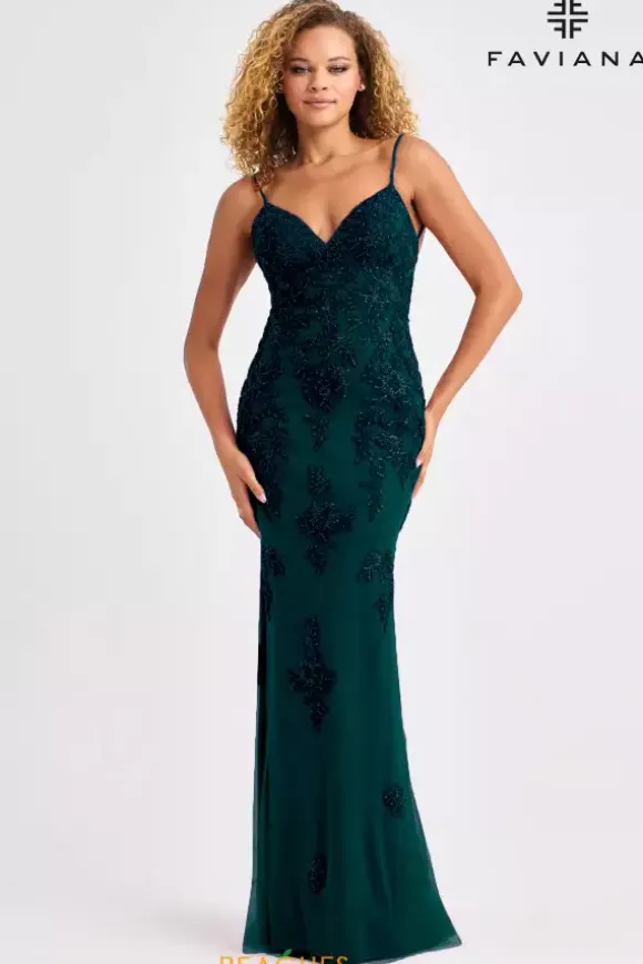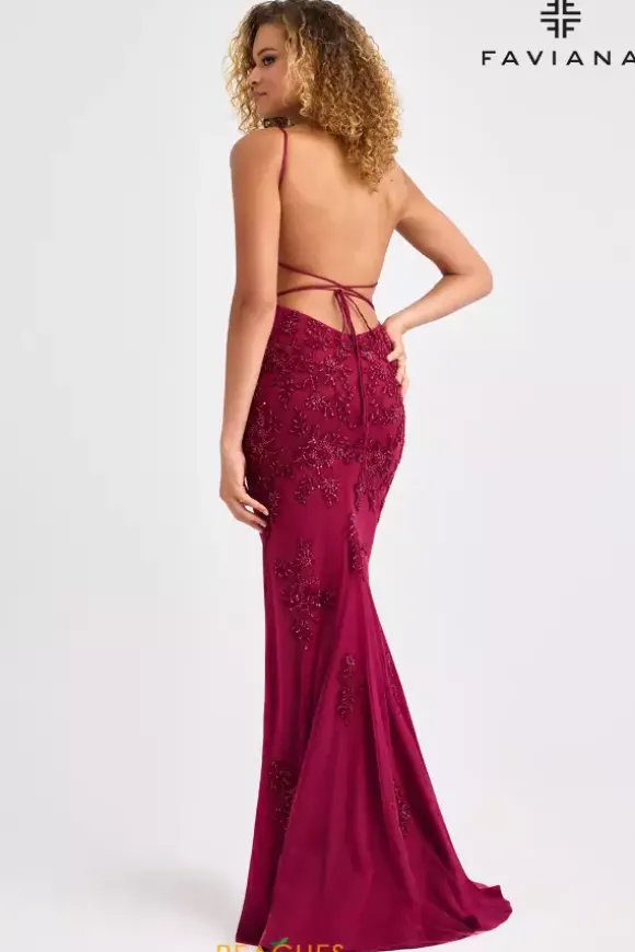 Turn heads left and right when you wear this flawless long fitted dress by Faviana style 11428. This unique dress features a v neckline that cascades into a open corset lace up sexy back. The bodice of the dress is decorated with applique and beading that also decorate the bottom of the skirt. The skirt of the dress also features tulle material and a train.