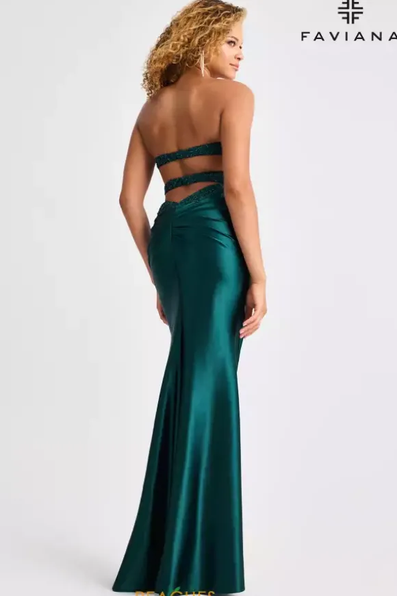 Shimmer and shine from all angles when you wear this long fitted dress by Faviana style 11429. This fetching dress features a strapless scoop neckline that cascades into a sexy open back with a back zipper. The bodice is beautifully decorated applique and beading and the skirt is made from stretch satin material with a slit.