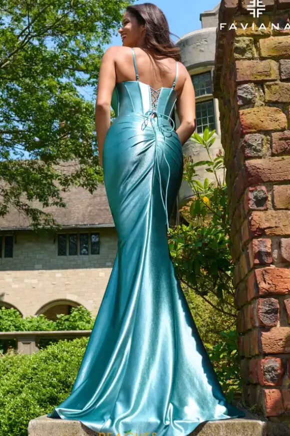 Feel elegant and regal in this ultra divine fitted dress designed by Faviana style, 11454. This piece displays a striking deep v neckline corset lace up bodice with dainty straps that guarantees a perfect fit to your preference. Entirely embellished in amazing jersey material all the way down to the long train.
