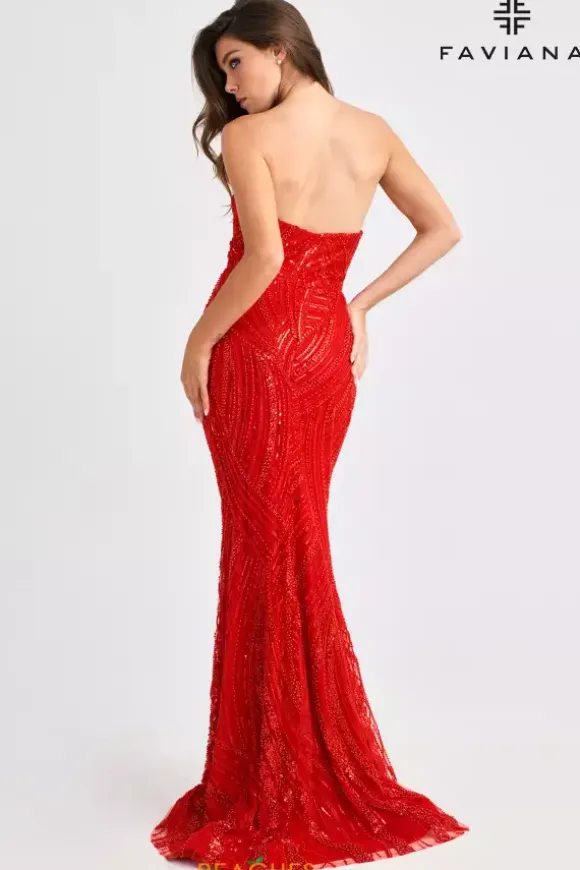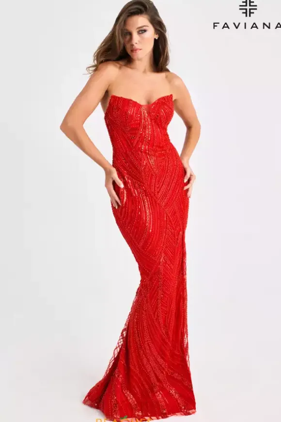 Show off your best look yet as you wear this full glam long fitted dress designed by Faviana style, 11463. This dress features a striking strapless v neckline bodice and remarkable novelty material. Fully decorated in outstanding beadwork from the top all way down to the lovely train. The thigh high slit completes this fabulous look.