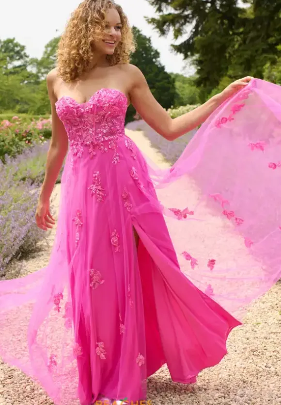 Dance the night away in this a line Faviana dress style 11474. The strapless sweetheart neckline bodice is corset inspired with a snug fitted. The bodice is decorated with gorgeous appliques that trickle down the flowing tulle a line skirt. The dress has a front side slit and is available in gorgeous colors.