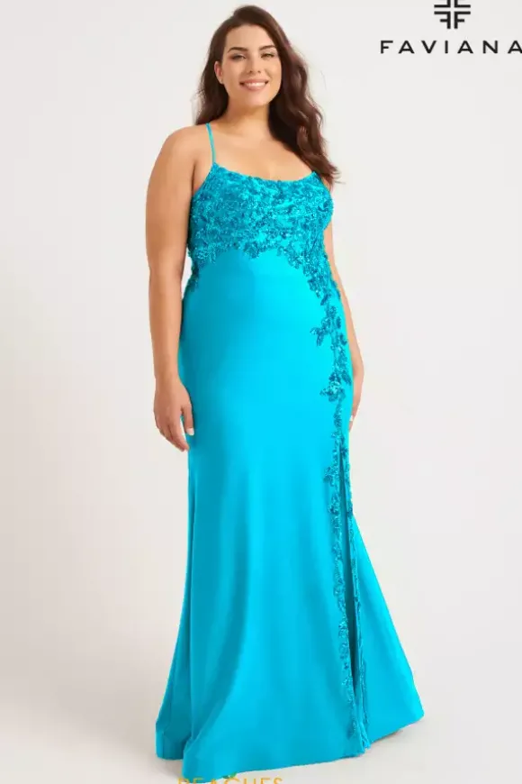 Elegant yet simple is the way to go to your next special event when you wear this long fitted dress by Faviana style 9570. This number has a gorgeous scoop neckline that follows to criss cross straps on the back. Beautiful beadwork going down the bodice’s skirt with lovely sequins. A front slit to give that final perfect touch.