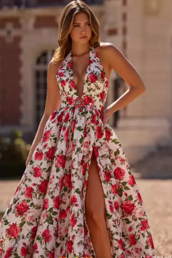 Be the it girl at your event in this Sherri Hill a-line dress style 57726. The fitted bodice has a fierce halter neckline with a plunging V cut that is met by a rosy beaded embellishment on the seam of the full rose detailed skirt. Strike a pose and show off the secret thigh high slit and striking sweep train.