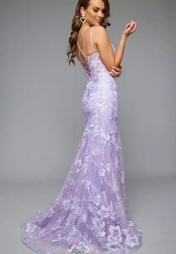 Show off your hour glass figure in this amazing Jasz Couture fitted long dress style 7657. The sheer illusion corset style bodice has exposed bone work and dual thin straps that turn into a lace up in the back. The fit and flare style skirt is embellished with floral inspired appliques completed with a long train.