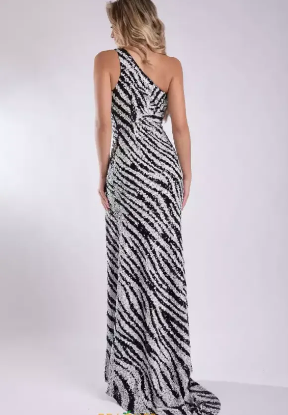 Show off your unique sense of style in this one of a kind long fitted dress by Jasz Couture style number 7934. This one of a kind dress features an asymmetrical single shoulder strap and a fun cut out with black mesh covering. The show stopping dress is completely embellished in stunning beadwork and sparkling sequins that will guarantee all eyes on you at any event you attend.