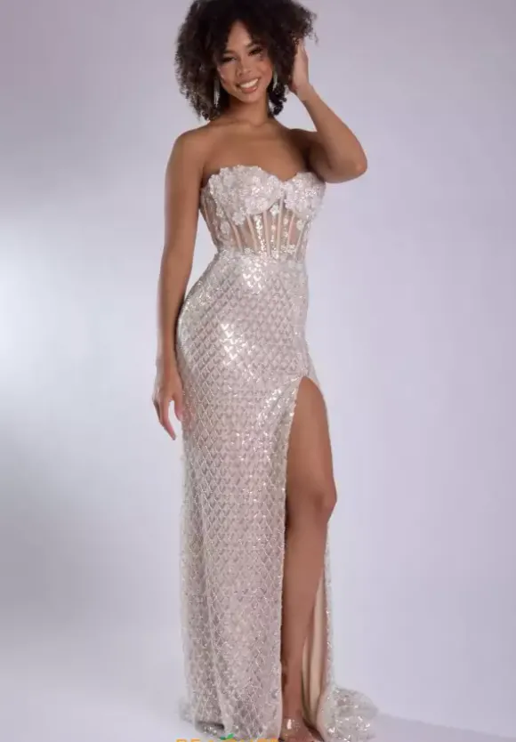 Be simply sophisticated in this glowy Jasz Couture prom dress style 7957. This figure gripping gown has a strapless sheer illusion corset bodice with a zip up closure. Radiant floral appliques are scattered throughout the bodice and the glowing long skirt flaunts a subtle crisscross pattern made with beads.