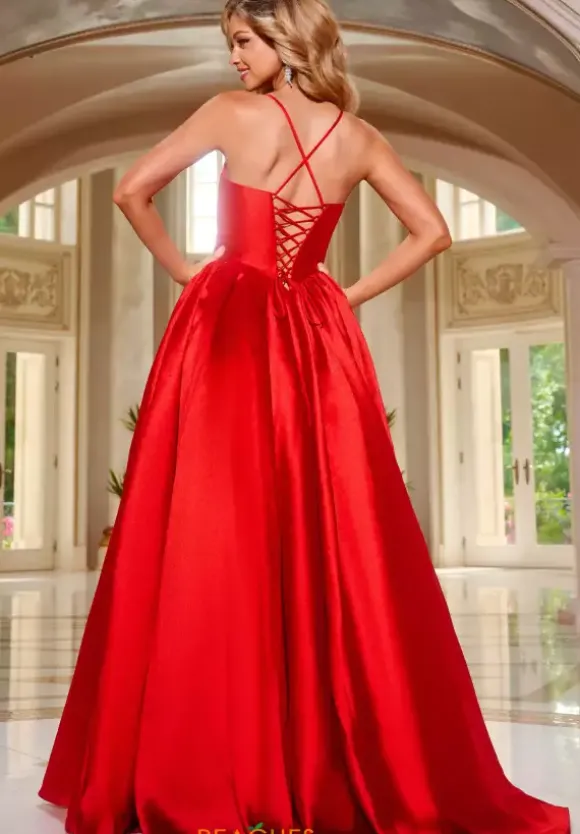 Dance the night away in this A line style dress made by Jovani, style 43199. This long style dress has a wonderful sweetheart shaped neckline and the material consists of a ton of satin material. This dress has a phenomenal corset, and a huge train that will have all attention on you throughout the entire night.