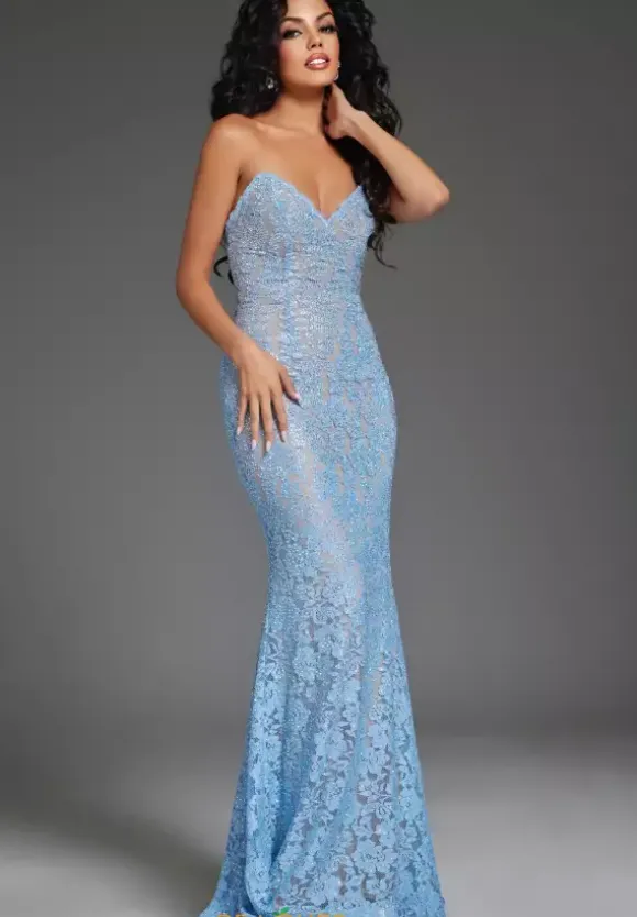 Stay on trend when wearing this long fitted dress by Jovani, style 43760. Featuring a unique modern strapless v- neckline leading to a sexy open back ending with a zipper closure. The bodice of this ensemble will hug your bodice beautifully all night long that will take people’s breath away. This ensemble is adorned with floral lace applique and dazzling beadwork throughout the dress. For the perfect final touch it has a marvelous train. You will for sure going to look beautiful at your next special event.