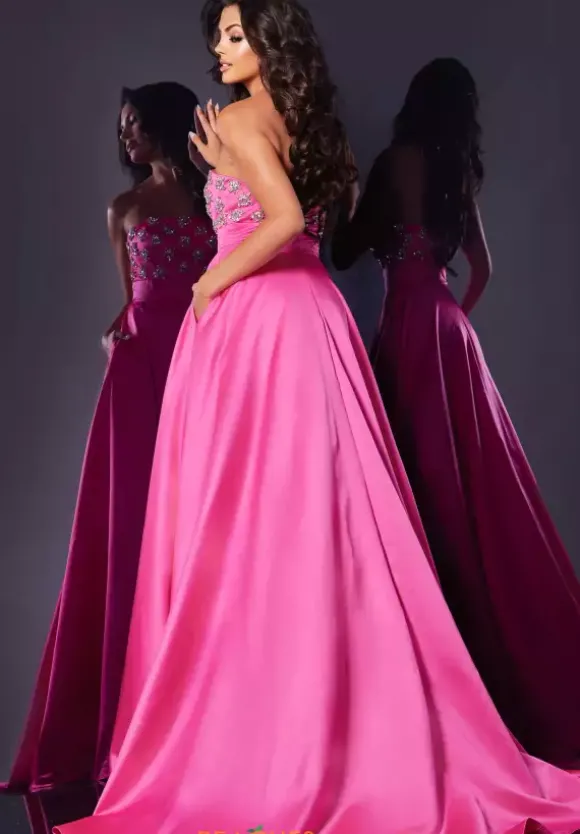 Dance the night away when wearing this long a- line dress by Jovani, style 43822. Showcasing a strapless neckline that leads to a back zipper closure. The silhouette of this bodice will hug your waist gorgeously. Adorned with beadwork appliques throughout the top. Featuring a satin bottom that’s going to make you look like a princess. To amp up the drama it has a classy high thigh slit and a gorgeous train.