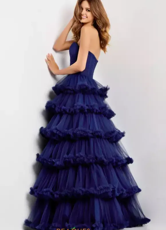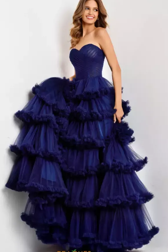 We are in love with this vintage inspired Jovani ball gown style 47139. This exquisite dress showcases a strapless sweetheart neckline with ruching details. The tulle ball gown skirt starts at the small of your waist in tiered layers. Each layer is trimmed with ruffles to add to the glam of this stunning look.