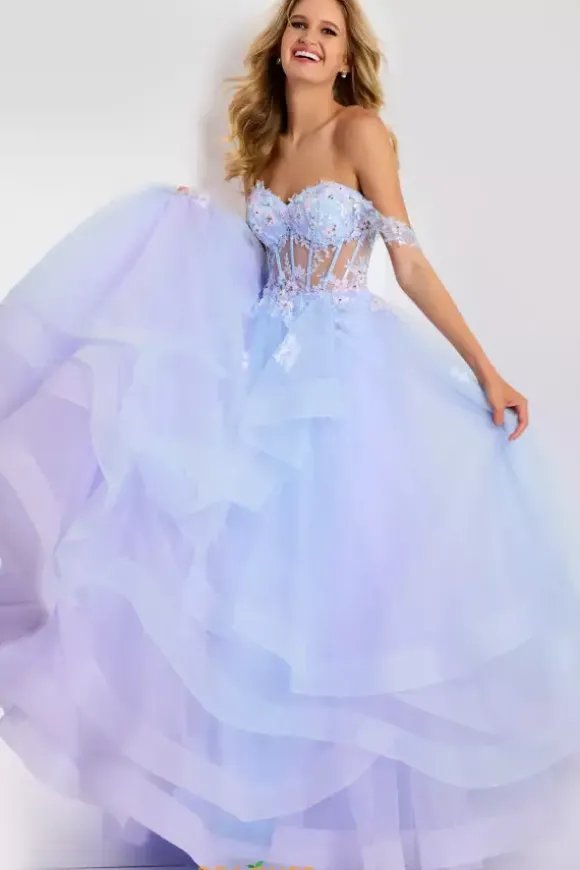Feel like a real life princess wearing Jovani long dress 47427. This magical ball gown showcases a lovely sweetheart neckline with elegant off the shoulder cap sleeves. The see through mesh corset bodice is featured showing off your waist. The full glitter tulle skirt will be sure to have all eyes fall on you.