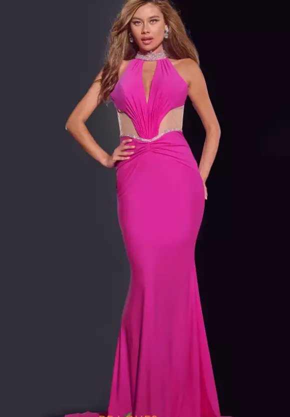 Become the talk of the night in this long and fitted dress made by Jovani, style D5002. This haltered style dress has a high neckline that is covered with gorgeous beaded details. The majority of this dress is made with jersey style material and has a long and extravagant train. You will instantly stand out with this fantastic look.