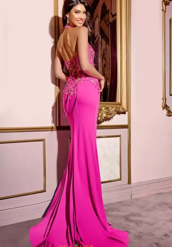 Step into your next event feeling like an absolute diva in this spectacular dress made by Jovani, style D5030. This long style dress is made with a ton of wonderful applique, beaded details, lace, and jersey style material. This halter style dress comes in three amazing colors, including a bright fuchsia/hot pink. This dress was made to amaze the crowd.