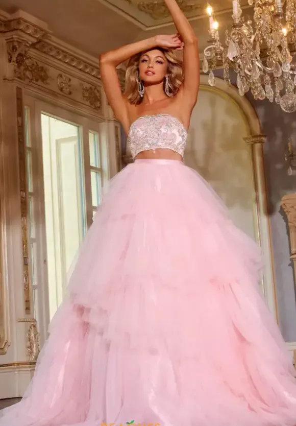 Look as if you belong in a fairy tale in this ball gown style dress made by Jovani, style D5112. This strapless dress is entirely pink and is a two piece style dress. The top part of this dress is covered in gorgeous beaded details and the rest of this dress is made with phenomenal tulle. This dress will have you feeling like a total princess.