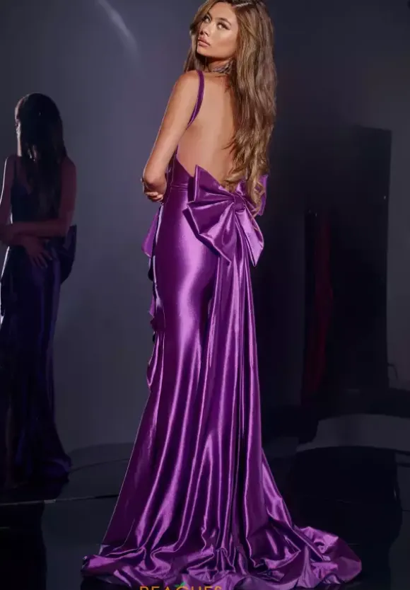 Look as if you are about to walk down a runway in this outstanding dres made by Jovani, style D5305. This dress has a lovely sweetheart neckline and is completely made out of satin material. The most extravagant part of this dress would have to be the large bow on the very back of the dress that leads down to a long train.