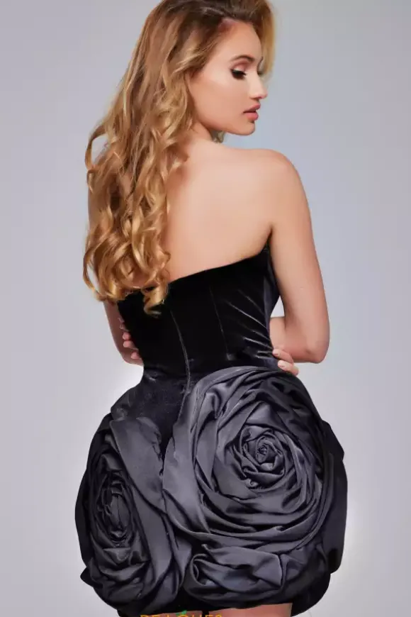 This dress is all about the dramatic chic floral piece. This floral piece will make you the talk of the night. This little black dress by Jovani, style 39848, showcases a luxurious velvet material that fits like a glove and looks so elegant. The bodice has a scoop strapless neckline and a convenient back zipper for a comfortable fit.