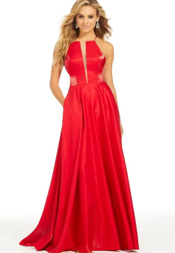 Be the lady in red and wear this gorgeous Just Peachy style 41009 for your social occasion. Featuring a high neckline with illusion inset, lovely open back with lace up detail and a flowing satin a-line silhouette. Add some big sparkly earrings and a matching clutch for the glamorous prom look, shop today at Peaches Boutique, your exclusive Just Peachy retailer.