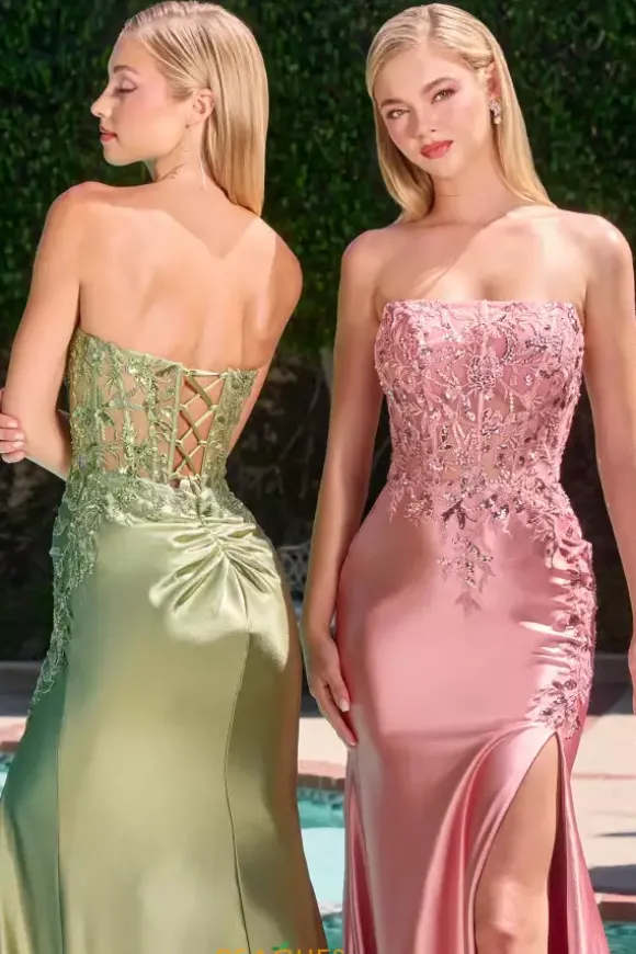 Satisfy your inner diva in this highly fashionable La Divine by Cinderella skin tight satin prom dress style 106C168. Color matching beaded appliques surround the strapless corset bodice and cascade down the single seam of the classic thigh high slit of the smooth floor length stretch satin sweep train skirt.