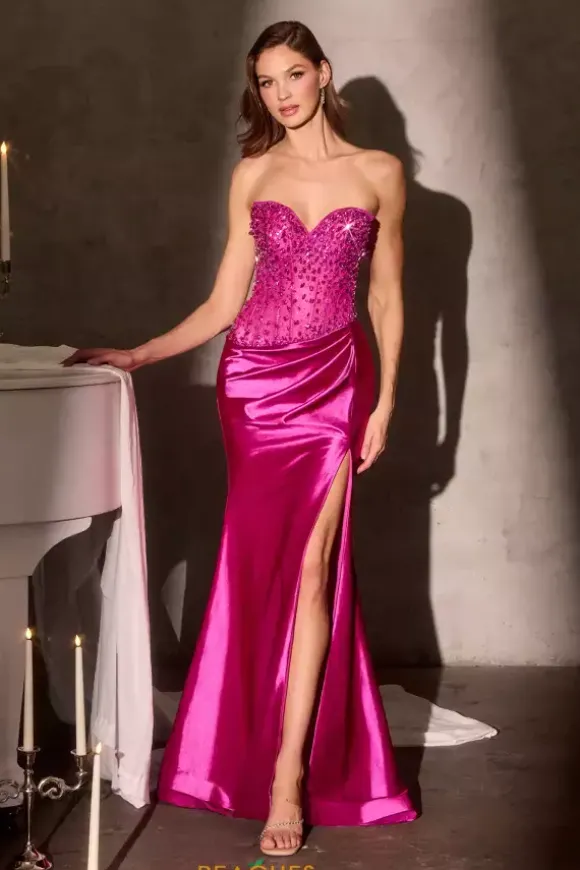 This electrifying 2026 La Divine by Cinderella prom dress style 106CC0447 combines intriguing with enticing. The body con structured corset dress boasts color matching crystals that complement the gleaming non beaded ruched satin high rise slit skirt. This glamorous dress is completed with a discreet zipper closure.