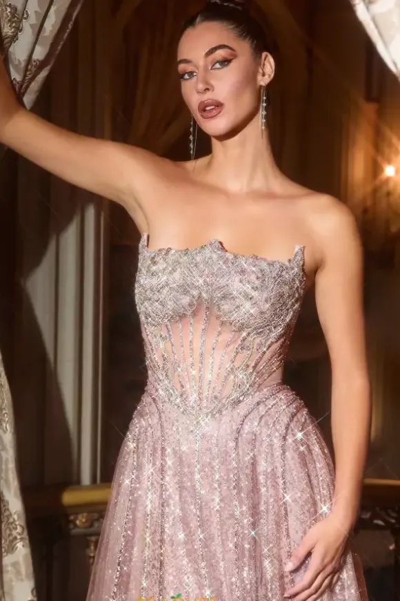 Light up the room in this ultra glistening La Divine by Cinderella a line prom dress style 106CD724. Every angle shimmers with high quality radiant stone accents that garnish the reverse strapless neckline and corset boning, perfectly matching the silver rows of beads that sparkle against the glittering tulle skirt.