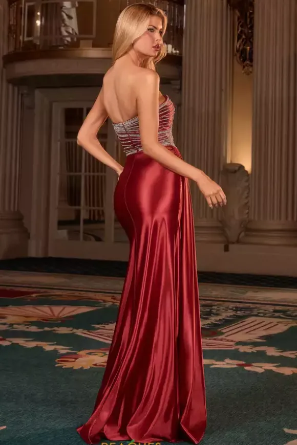 Show off your sophisticated side with this gorgeous La Divine by Cinderella long dress style J886. The strapless sweetheart neckline bodice is bejeweled with sparkling rhinestone beadwork in a ribbon detail. The asymmetrical drop waist line is ultra flattering with ruching details. The hanging overskirt falls right above the thigh high slit.
