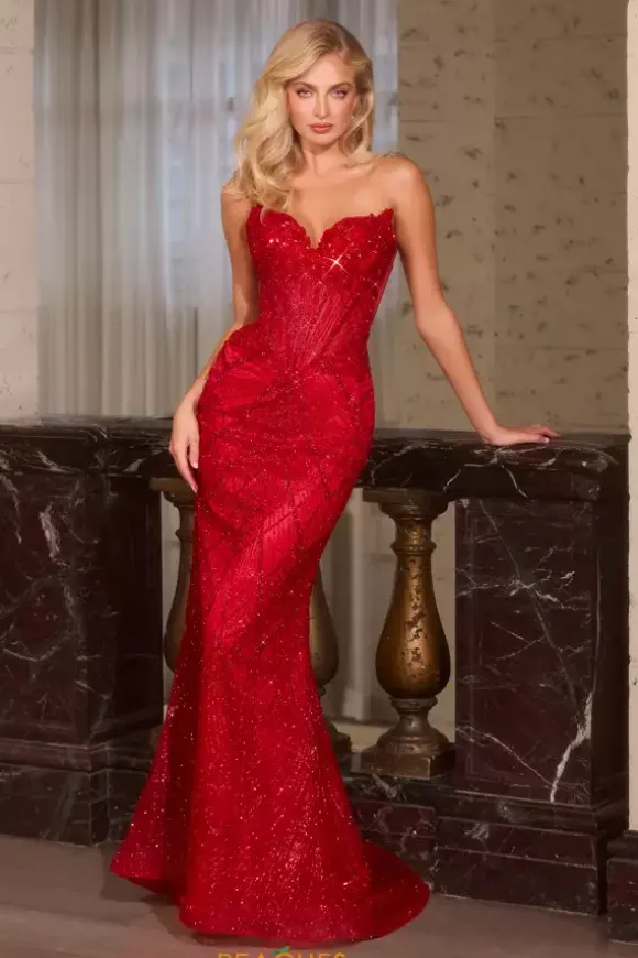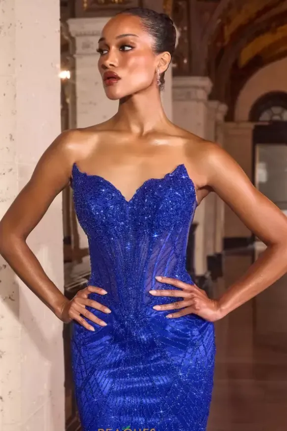 Shimmer and sparkle from all angles when you show up in this striking La Divine by Cinderella long fitted dress style J888. The strapless v neckline long waisted bodice is made from a sheer illusion material. Exposed boning detail and sparkling appliques adorn the bodice as well. The glitter tulle skirt adds to the glam factor.
