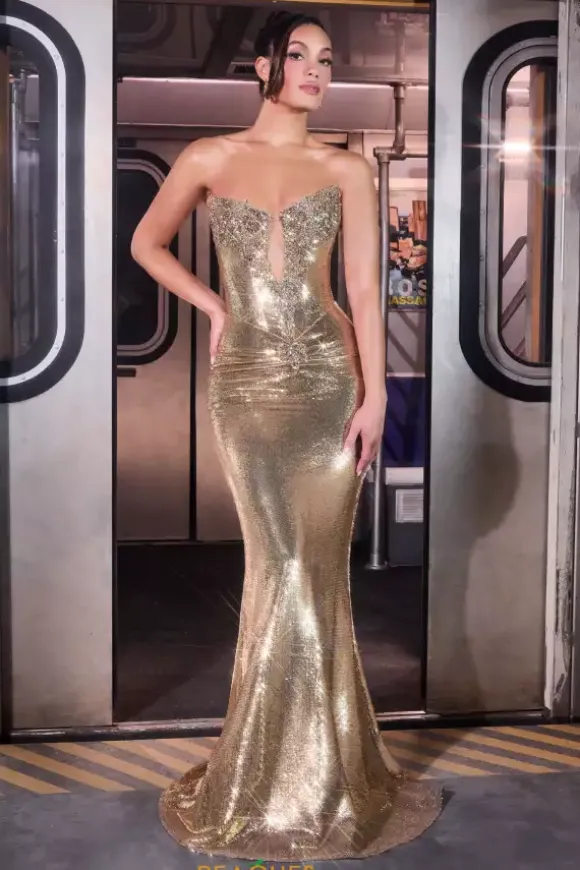 Be the most memorable in this unforgettable La Divine by Cinderella sequin encrusted prom dress style 106J894. The dramatic scooped neckline flaunts a diamond cut down the center surrounded by intricate beaded patterns that glimmer across the bust and down the center against the color reflective sequins.