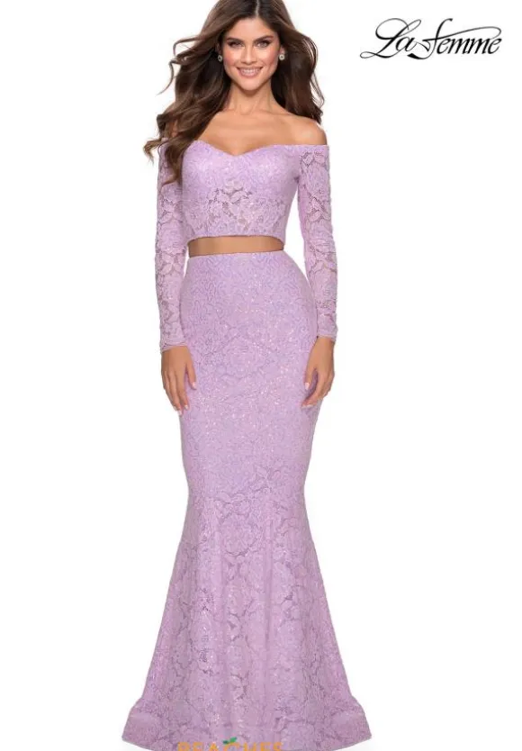 Va va voom all eyes will be on you in this charming La Femme dress style 28666. This alluring ensemble highlights a fitted crop top, paired with an off the shoulder neckline and edgy long sleeves. Matching perfectly to the top is a fitted skirt made in a delicate lace material giving your dress a romantic touch.