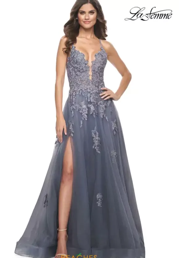 Feel like a princess in this magnificent long and A line style dress by La Femme. This dress will have all eyes on you as you dance the night away with this dress that has a great flow and a comfortable slit on the side. This dress also has an open back and applique material that will make great for pictures.