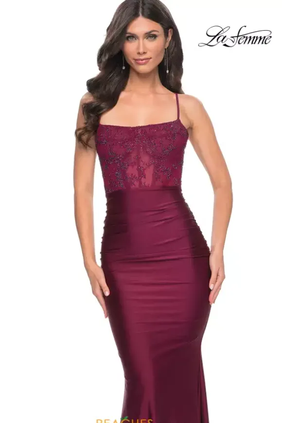 Fun and fabulous, this gorgeous La Femme dress 31857 is an ideal choice for your next social occasion. This breathtaking ensemble features a scoop neckline and dainty thin straps. The lace bodice accentuates your curves, while the lace up closure defines your hourglass silhouette. Made in a fitted jersey fabric, the long fitted skirt showcases an elegant sweep train.