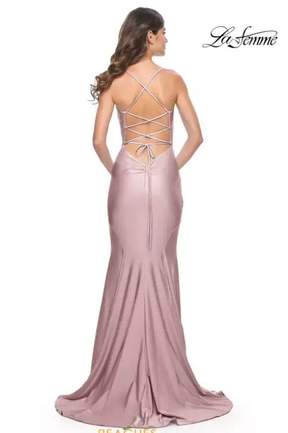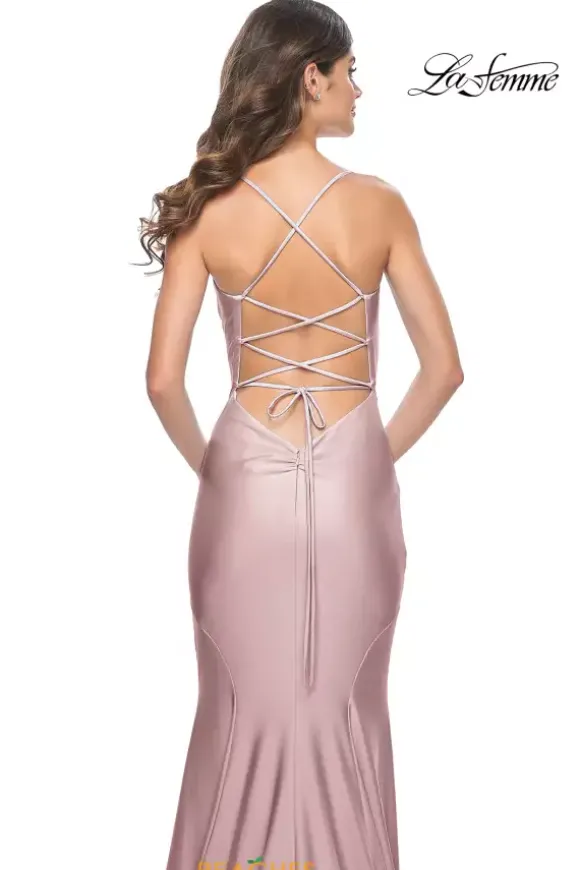 This beadless jersey prom dress 31878 designed by La Femme is perfect for anyone looking to enhance their figure effortlessly! Cinch and adjust the fitted bodice to your neckline with the lace up closure featured on the back. Strut effortlessly with the classic thigh high slit and graceful sweep train