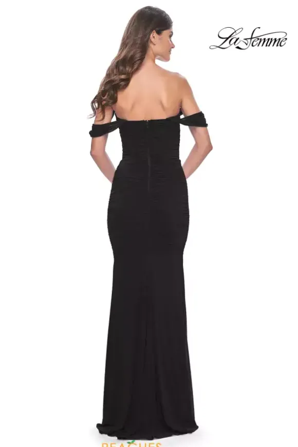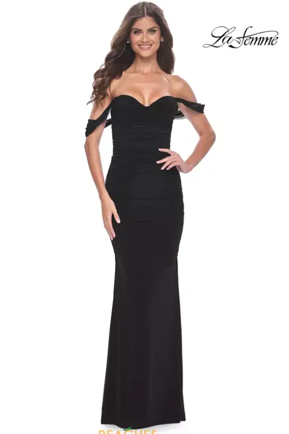 Have all eyes on you in this astonishing long and fitted style dress by La Femme, style 31914. This off the shoulder dress has an incredible sweetheart neckline and a is completely made with jersey style material that comes in either black, burgundy, green, or a show stopping royal blue. To add on to everything, this dress has a simple back zipper.
