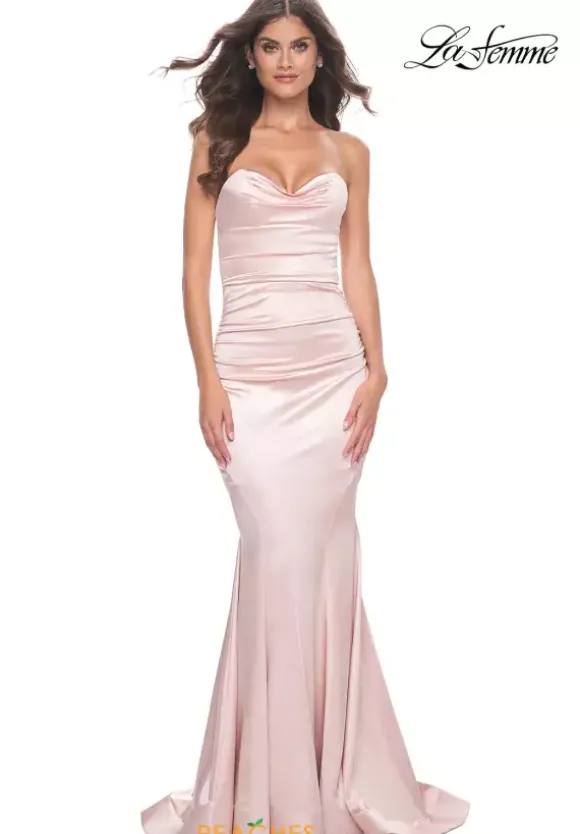 Show off your elegant sense of fashion with this ultra elegant beadless jersey dress 31915 designed by La Femme. From the strapless sweetheart neckline down to the long sweep train, this fitted dress features ruching throughout the bodice, side seams, and the zip up closure for a flattering 3D effect.