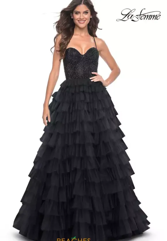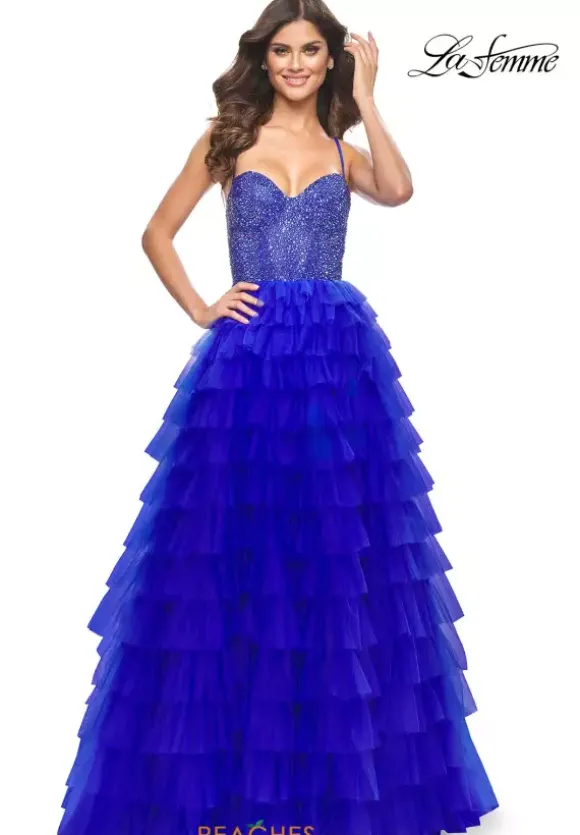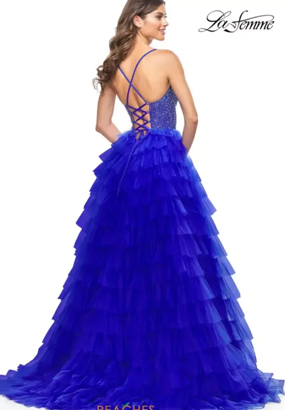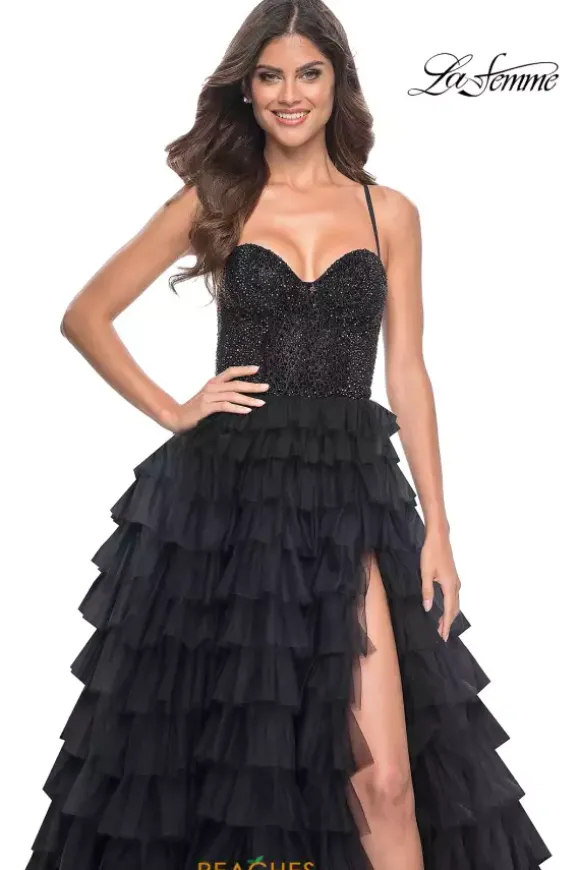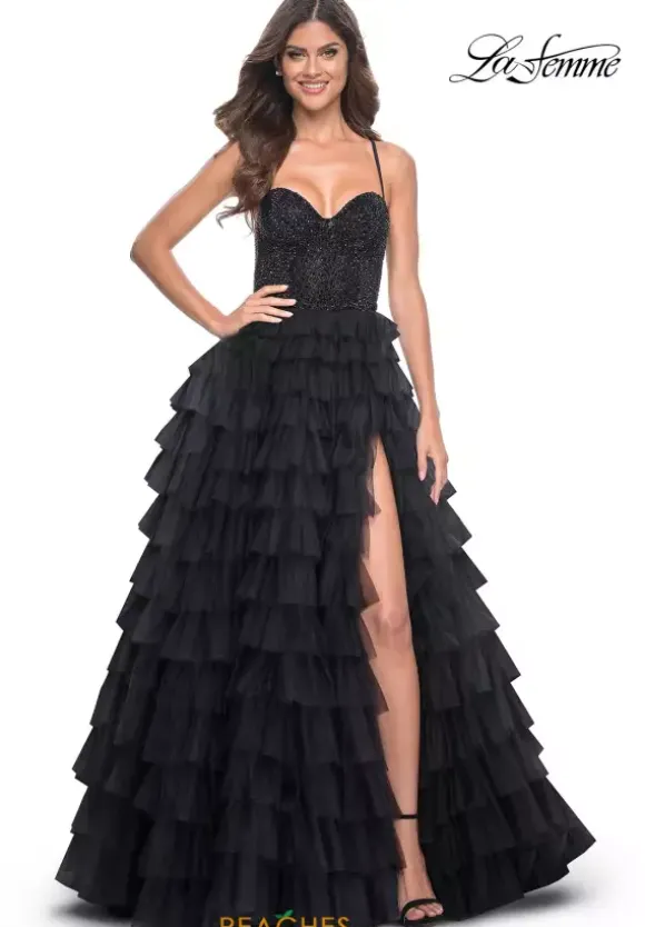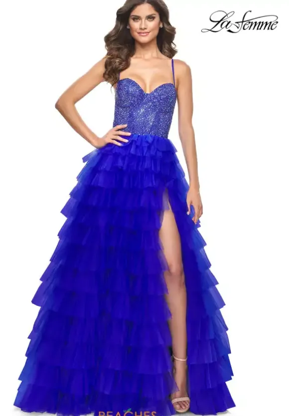 Be the showstopper at your event when you wear this alluring La Femme A-line prom dress 32002. This flattering A-line consists of a cinchable fully beaded corset bodice that hugs the small of your waist and gives you a radiant sparkle. The lavish tulle skirt creates a flattering silhouette and flaunts a thigh high slit.