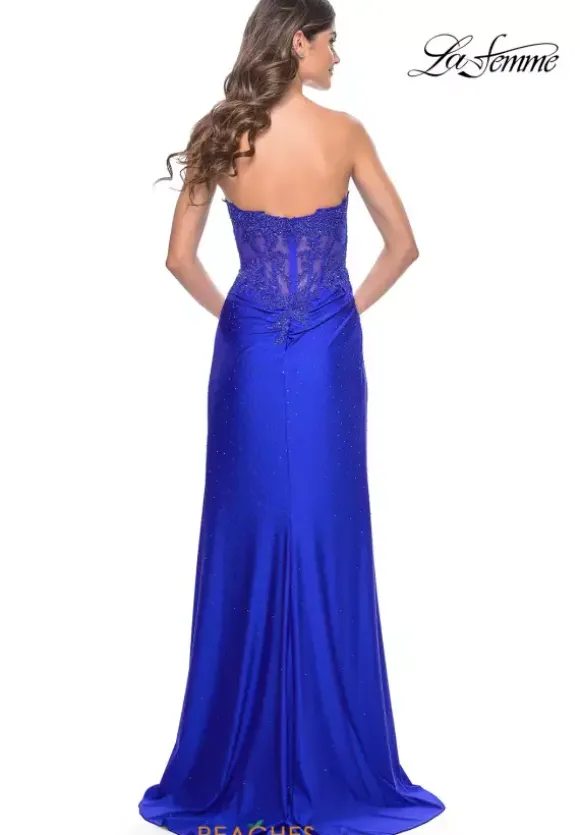 Be the most memorable in this unforgettable La Femme prom dress 32011. Elegant beaded lace adorns the strapless zip up corset bodice for a subtle shine and flattering ruching is featured along the seam of the Thigh high slit for an elegant touch. This gown is created with a classic sleek sweep train.