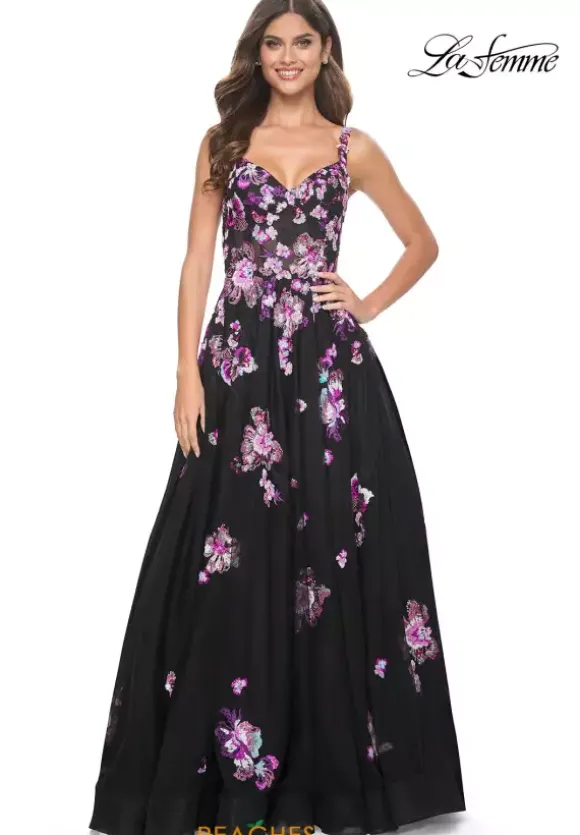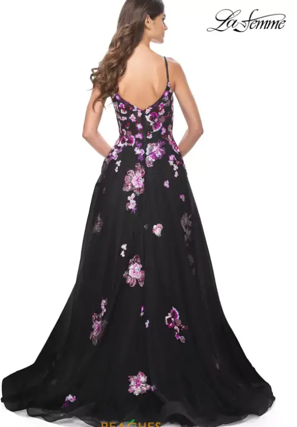 Fall in love with this impeccable La Femme style 32030, a phenomenal gown perfect for your senior prom. Picture perfect, this marvelous style features an elegant v neckline and dainty thin beaded straps. Lustrous sequins adorns the entire a line silhouette highlighting a vivacious floral detailing that is pure perfection. Made in a graceful tulle fabric, the gorgeous a line skirt showcases a high alluring slit and exquisite sweep train.