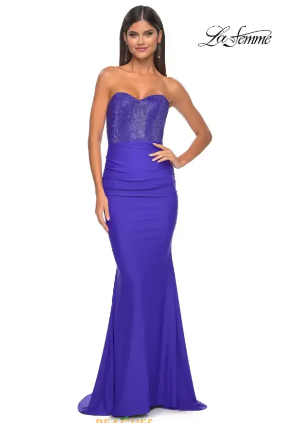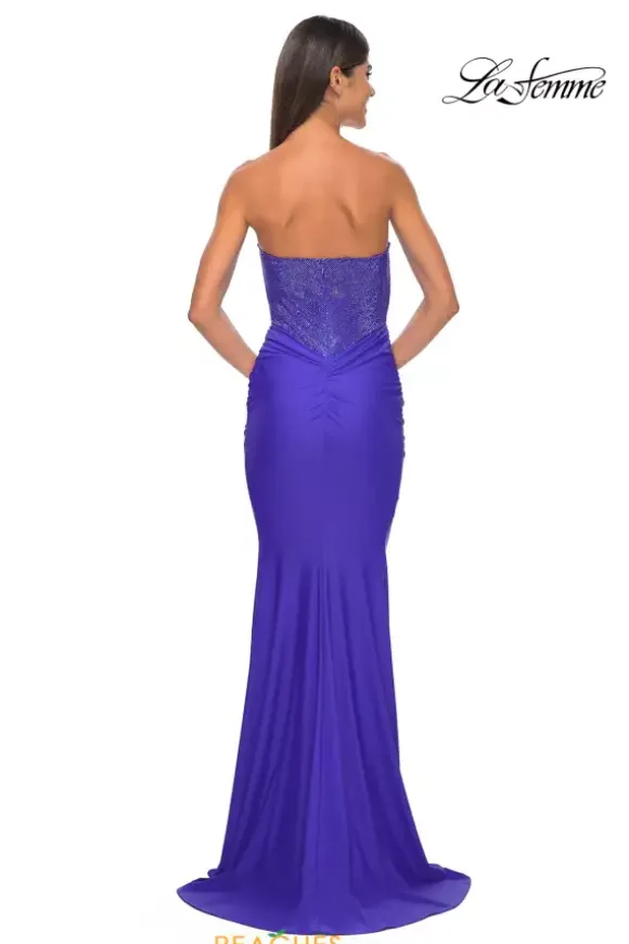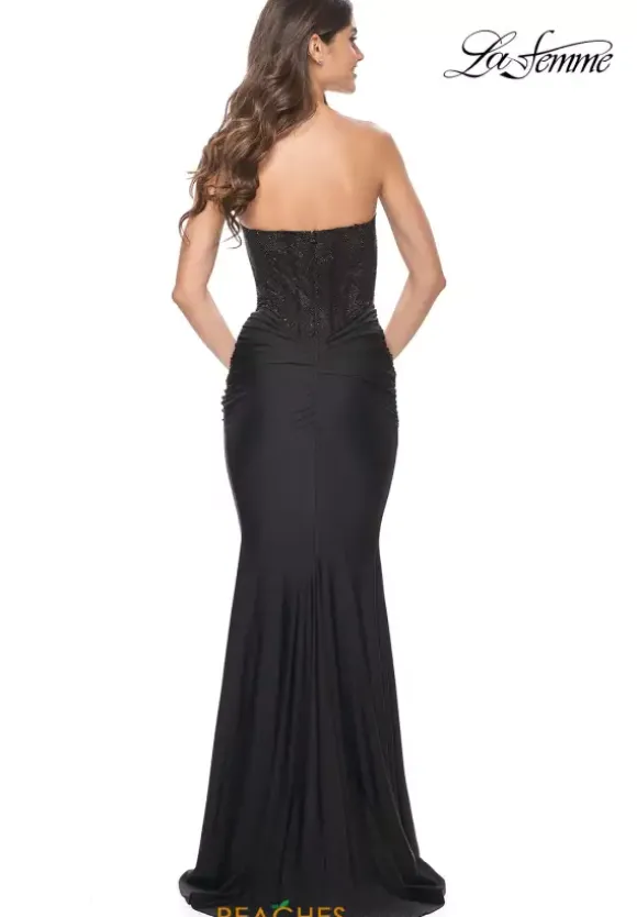 Red carpet ready this sophisticated La Femme dress 32069 a fabulous choice for prom. Alluring, yet sophisticated this breathtaking gown features a chic strapless sweetheart neckline and fitted silhouette. Shimmering beads adorn the bodice creating a dazzling embellishment. Made in a sleek jersey fabric, this beautiful gown cinches at the waistline defining your hourglass silhouette